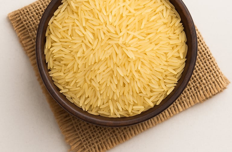 A premium quality, parboiled basmati rice known for its golden hue, long grains, and aromatic flavor. It stays fluffy and non-sticky after cooking, making it ideal for biryanis, pulao, and festive dishes. Rich in nutrients and taste, it brings royal perfection to every meal.